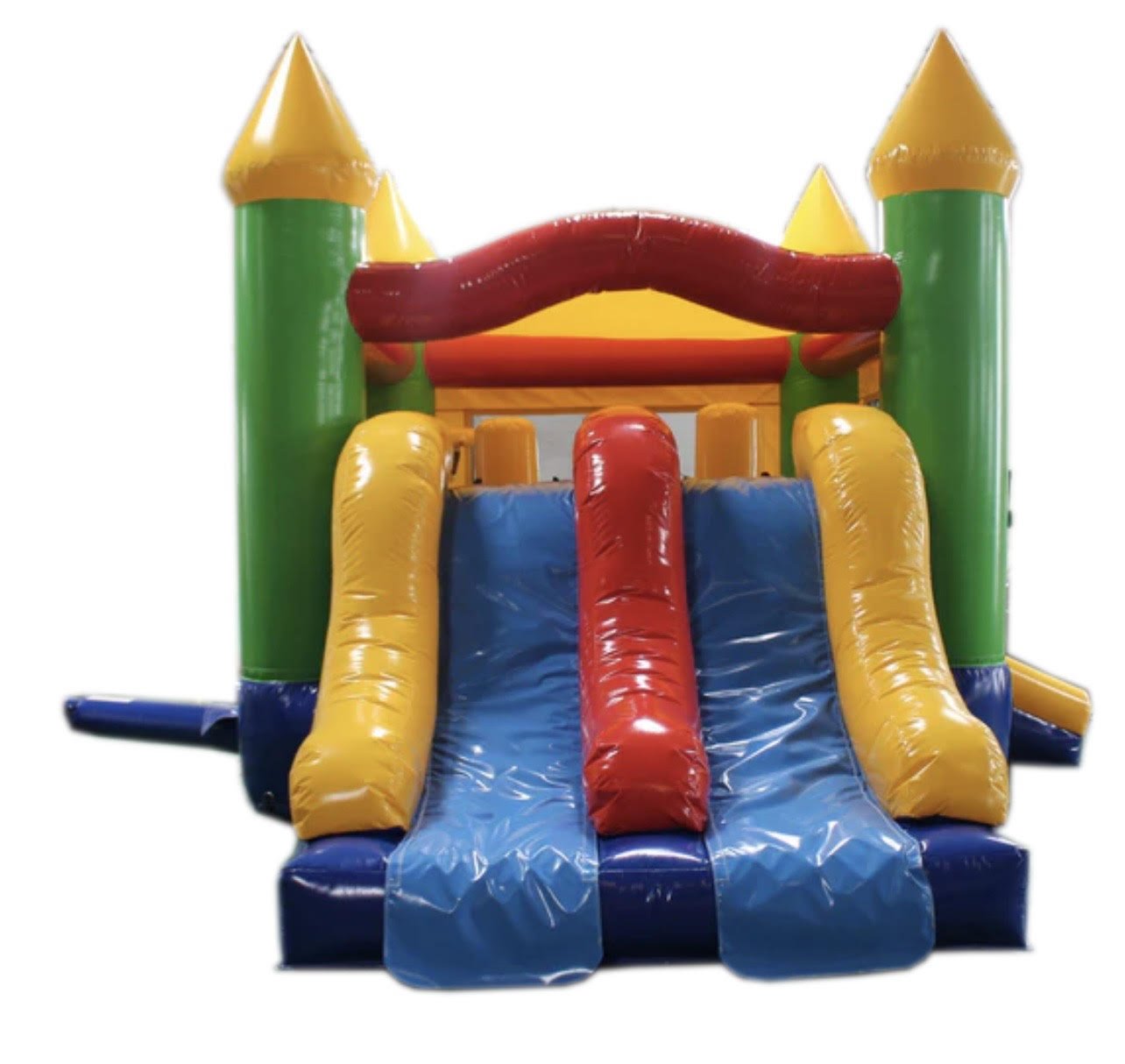Don’t let the size fool you- this unit has a weight capacity of 900lbs. Perfect for smaller children and toddlers. The inside has a small climbing wall that leads to the double slide and equipped with a “punching pop-up pillar” to add to the entertainment. This unit measures 20’Lx15’Wx13’H. The Deluxe Rainbow Combo currently rents for $180 for 4hrs or make it an 8hr day for $50 more.