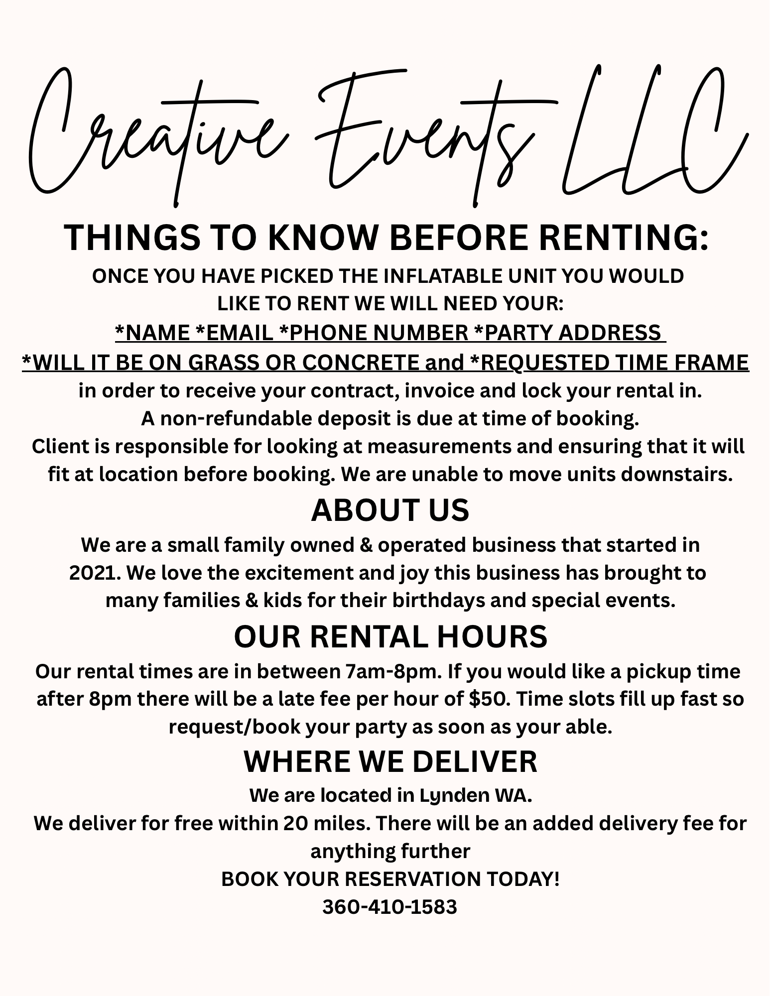 What to expect day of delivery: We try to arrive 1 hour (or earlier) before scheduled time to ensure everything is up and running by your scheduled start time. Depending on our schedule we may ask to come earlier. We will do our best to let you know 1-2 days in advance. We make a drop off route depending on time and location. There are times we have to drop off early morning in order to accommodate everyone. This is at no extra fee to you. Many days we have 5+ units with a scheduled start time all the same or similar. Also- some units require more lengthy time for set up. With pick-up we try to be on time but will let you know if we will be late. If you are at a location that doesn’t allow us to be out of your scheduled timeframe please let us know and we will make note. Always feel free to text/call 360-410-1583 with any questions about delivery/pick up.
